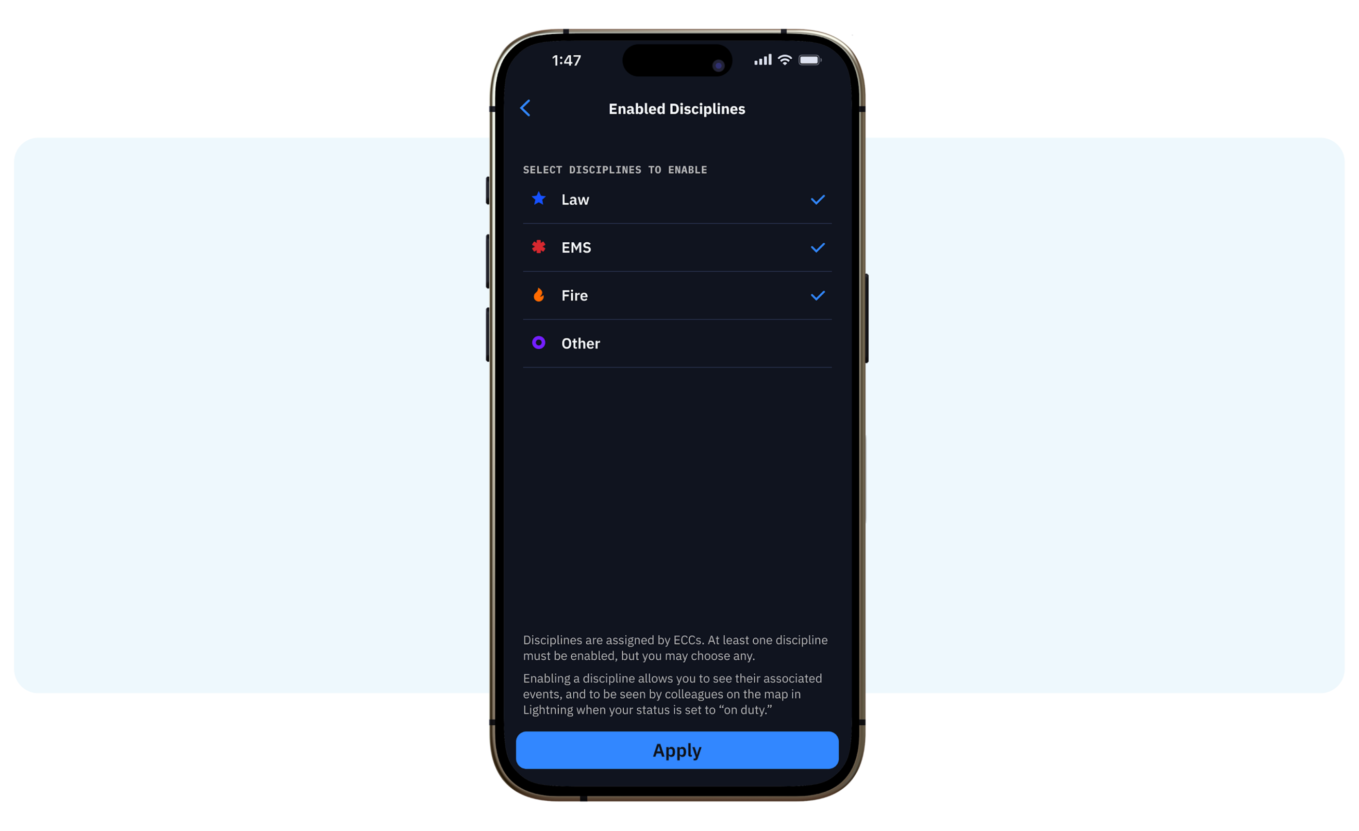Users who are assigned multiple disciplines can toggle between them in the app depending on their current assignment. ECCs retain control over which disciplines a responder is allowed to see, ensuring the right balance of flexibility and oversight.
